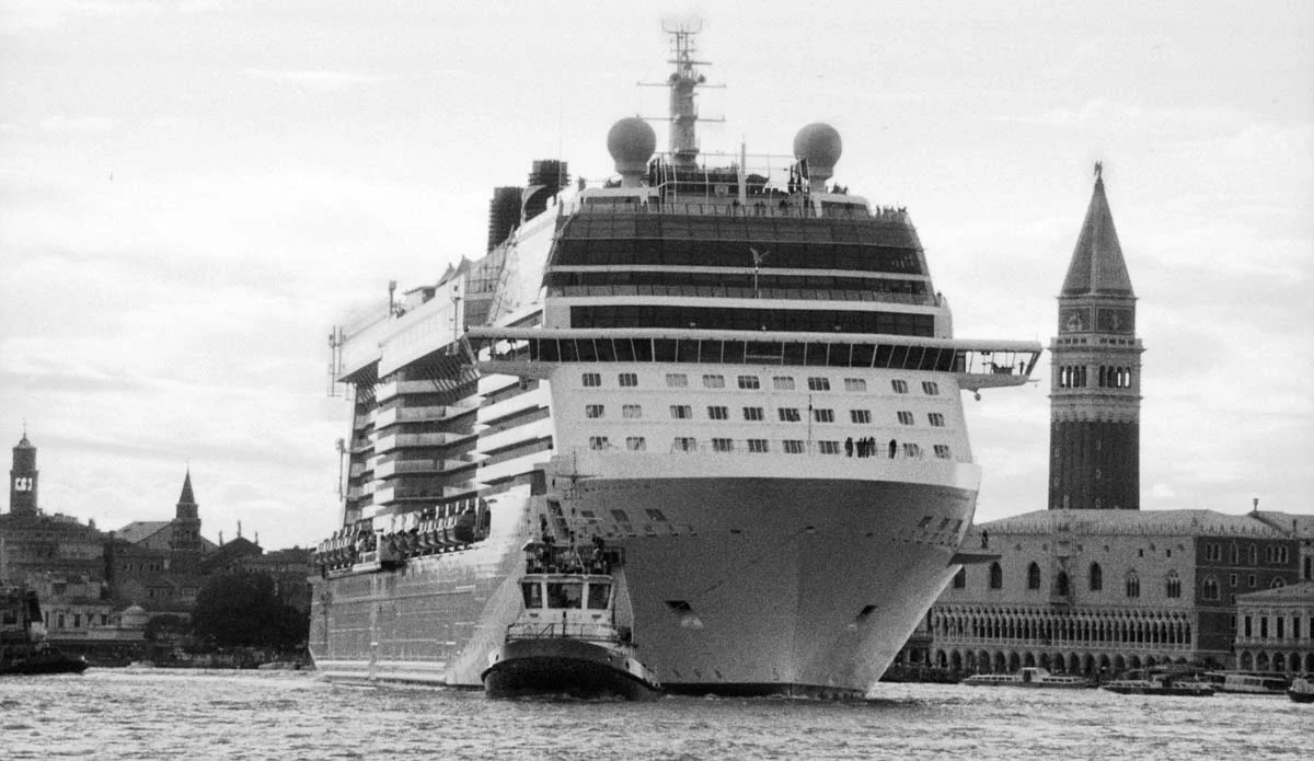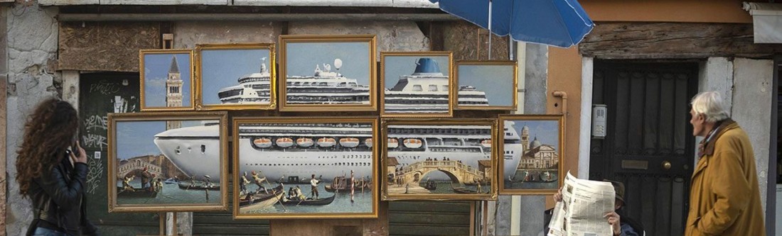 L’offerta aveva il palese sapore di rovesciare, nel suo opposto, la libera visione di un artista e le immagini della sua percezione del degrado visivo offerto dal passaggio dei ciclopi galleggianti. In realtà, questi miscugli di lamiere e tecnologie, con il loro gigantismo fuori posto, contribuiscono a trasformare la Laguna in un braccio di mare, mentre a Venezia umiliano e mandano fuori scala quei monumenti che sfiorano appena, rubando loro la scena in modo silenziosamente violento, trasformandoli, di colpo, da simulacri antichi in cose che appaiono di colpo inutili oggetti di una scenografia di sfondo improvvisamente privata, nel confronto, di vita propria. Immagini di una nuova asimmetria, esasperata dalle differenze dei volumi e degli stili messi artificialmente a confronto: l’ultima, la più recente e la meno interessante, delle asimmetrie che, comunque, offre Venezia.